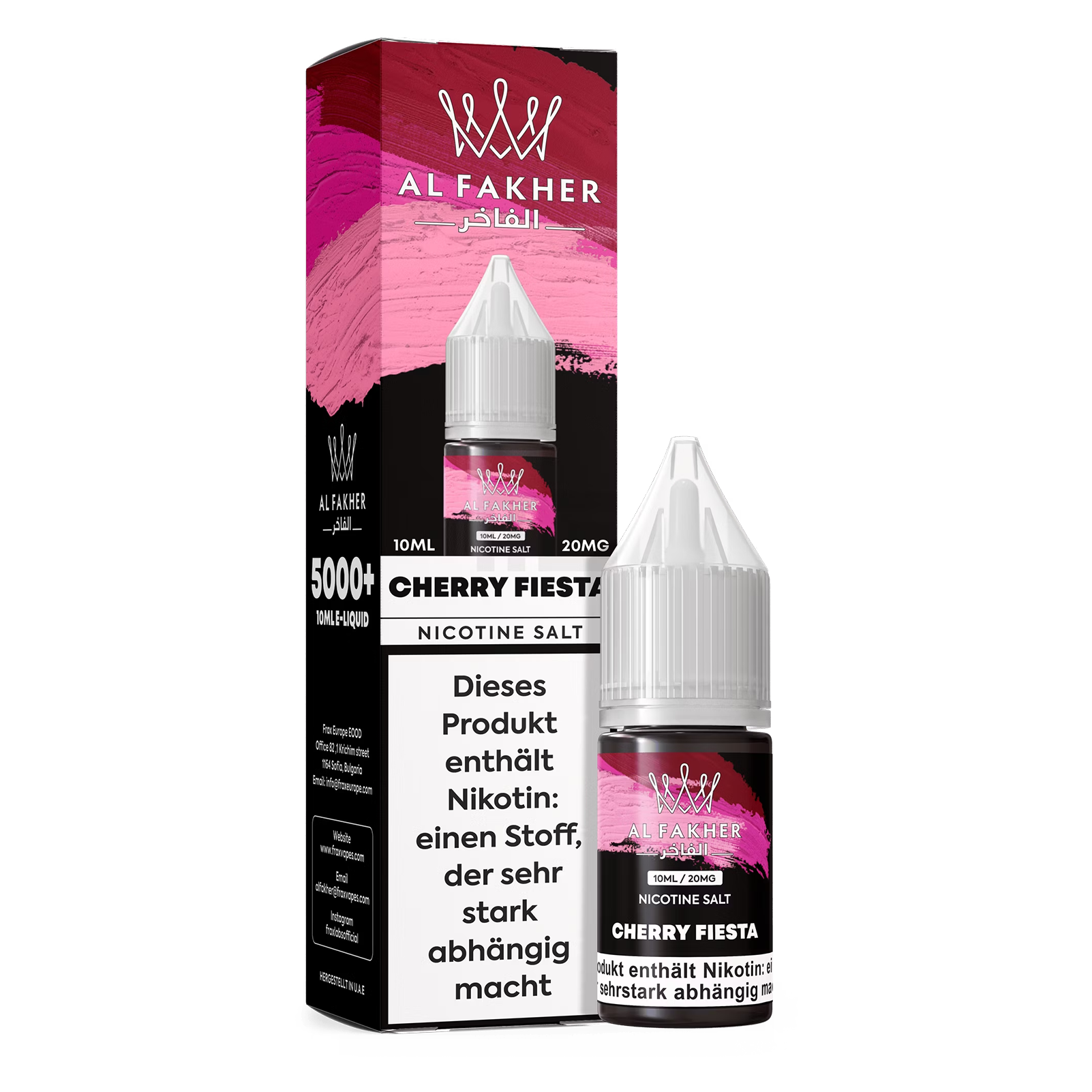 Das Produkt Al Fakher Liquid 10ml - Cherry Fiesta 20mg weist einen Inhalt von 10ml auf und enthält ein Aroma mit der Bezeichnung Kirsche.