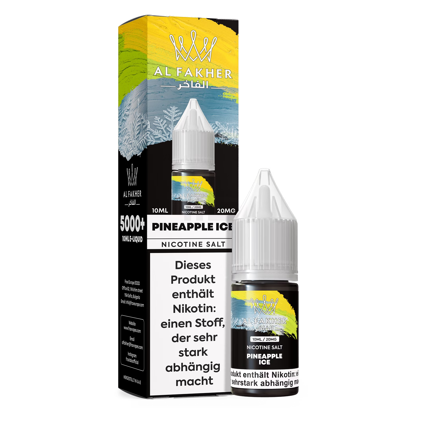 Das Produkt Al Fakher Liquid 10ml - Pineapple Ice 20mg enthält 10ml Liquid. Der Nikotingehalt beträgt 20mg.