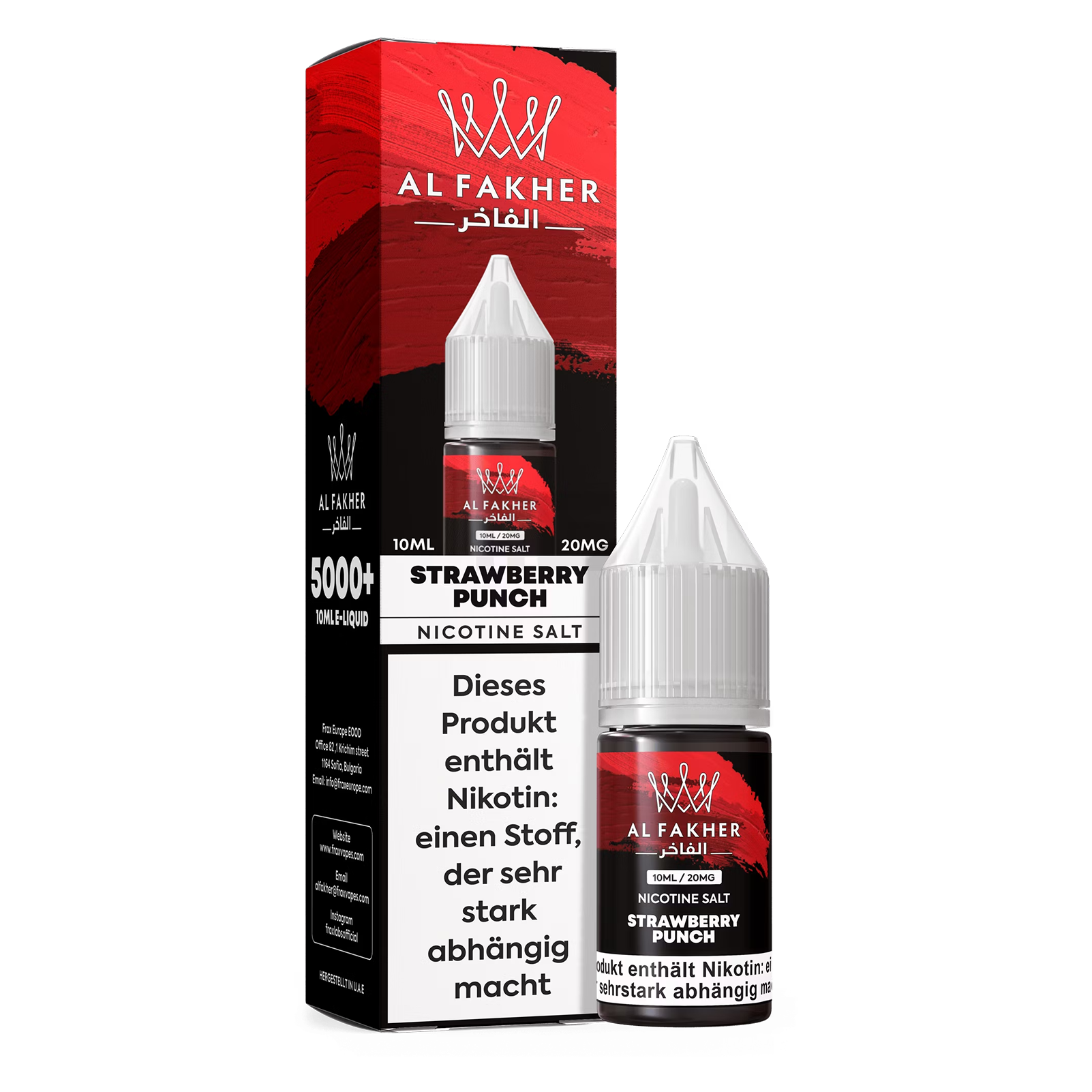 Das Produkt Al Fakher Liquid 10ml - Strawberry Punch 20mg enthält 10ml Liquid mit einem Nikotingehalt von 20mg/ml und dem Aroma Erdbeere.