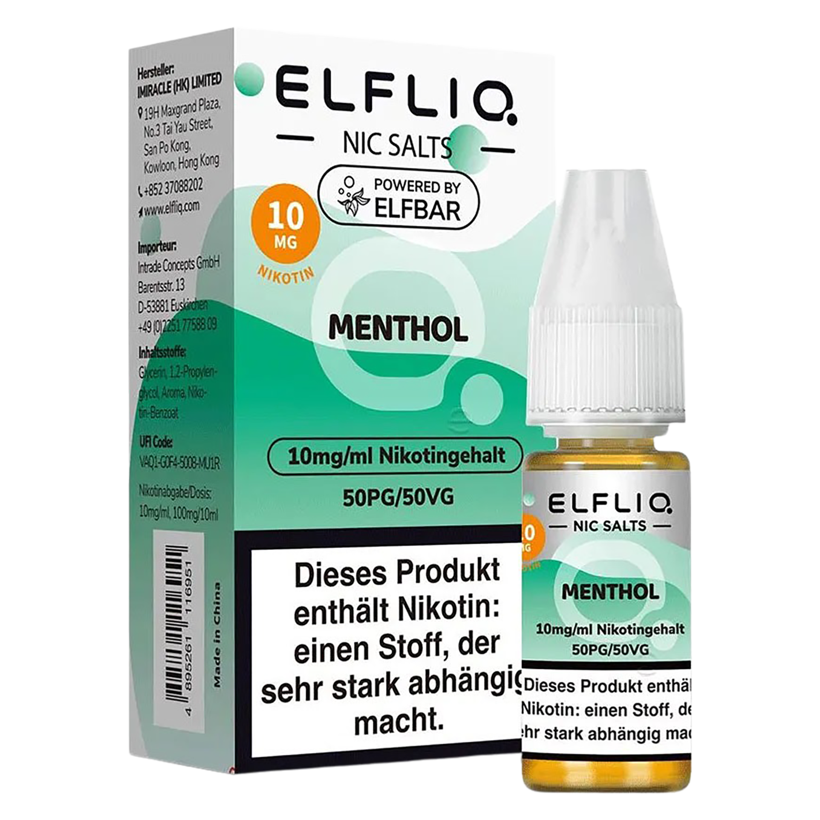 Elfliq - Nikotinsalz Liquid 10mg/ml - Menthol von Elfliq ist ein nikotinhaltiges Liquid für elektronische Inhalationssysteme mit Bezug zu Anwendungen im Umfeld von Wasserpfeife und ähnlichen Geräten.