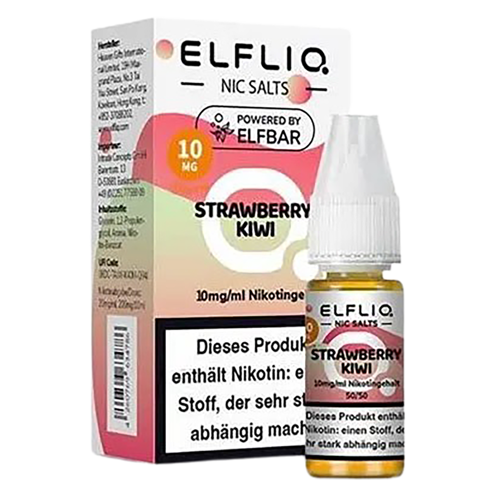 Das Produkt Elfliq - Nikotinsalz Liquid 10mg/ml - Strawberry Kiwi wird in einer Flasche mit einem Inhalt von 10ml bereitgestellt. Der Nikotingehalt beträgt 10mg/ml.