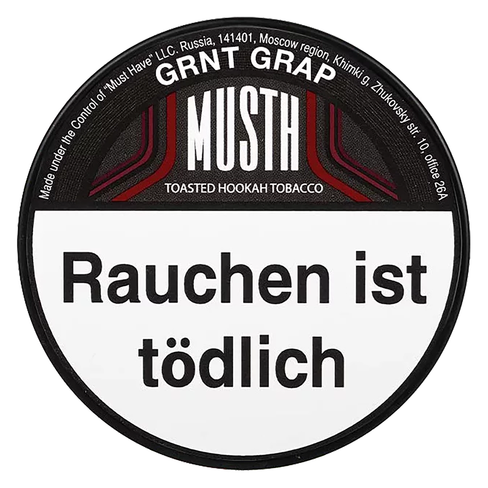 Must H 125g - Grnt Grap von Must H ist ein Tabakerzeugnis für die Verwendung in der Wasserpfeife. Die Bezeichnung dient zur eindeutigen Identifikation des Produkts im Sortiment verschiedener Tabakköpfe und verwandter Anwendungen.